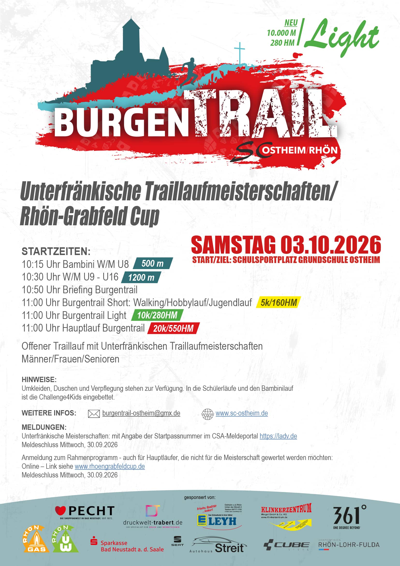Am 3. Oktober 2026 lädt der SC Ostheim erneut zu den Unterfränkischen Traillaufmeisterschaften ein. Und natürlich sind auch alle anderen Laufbegeisterten wieder herzlich eingeladen, auf dem Burgentrail mitzumachen.